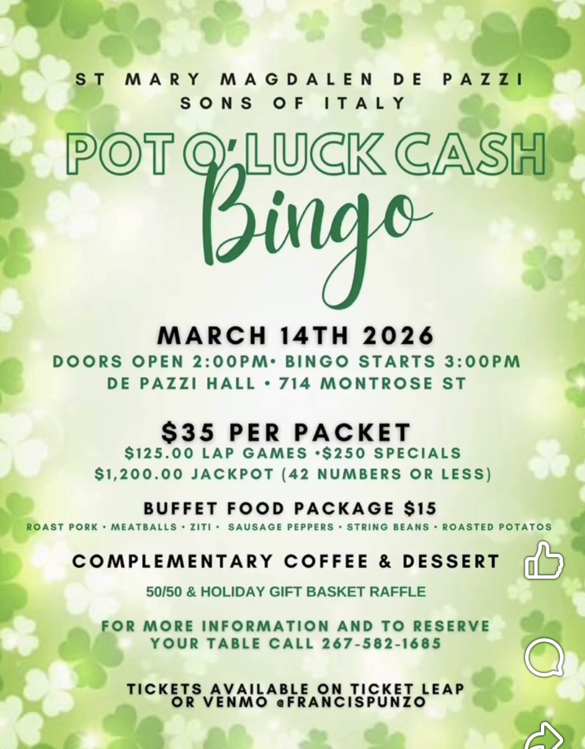 Join us for a fun afternoon of Pot O’ Luck Cash Bingo on Saturday, March 14th, 2026 at De Pazzi Hall!